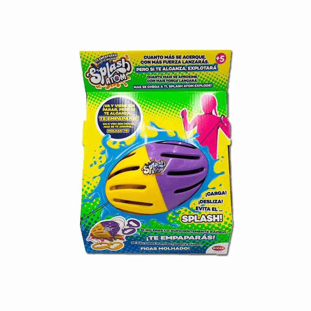 - Juego interactivo de agua: Splash Atom se llena con globos de agua en su interior. Dos jugadores se colocan en extremos opuestos, cada uno sujetando un par de asas. Al abrir los brazos con fuerza, el Splash Atom se desliza rápidamente hacia el otro jugador. El objetivo es evitar que el dispositivo llegue a tus asas; si lo hace, ¡el globo explota y te mojas!