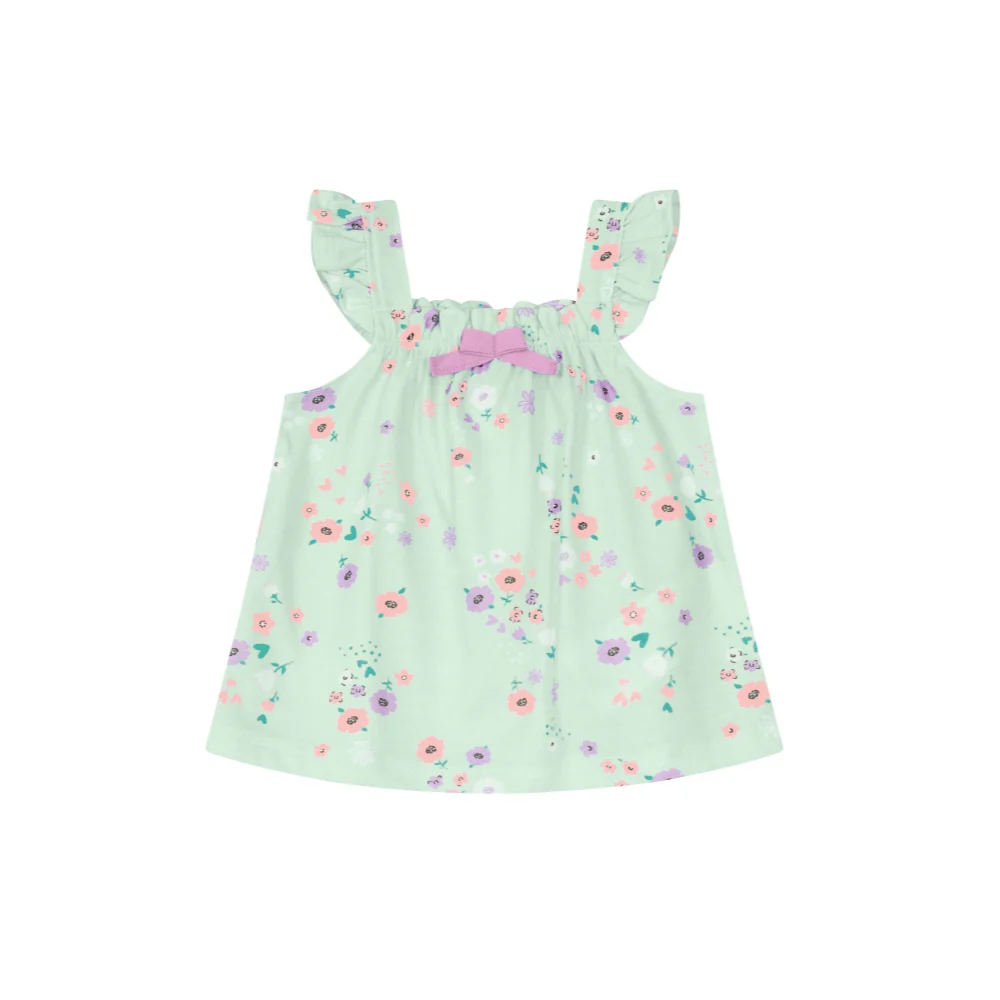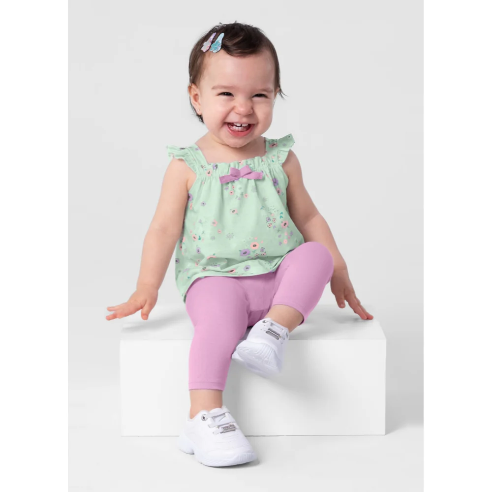 Conjunto de niña compuesto por blusa y pantalón legging, la blusa confeccionada en tejido de punto tiene mangas de copa con volante, estampado giratorio, escote cuadrado con elástico y lazo, mientras que el pantalón tiene cinturilla elástica y es de color liso.