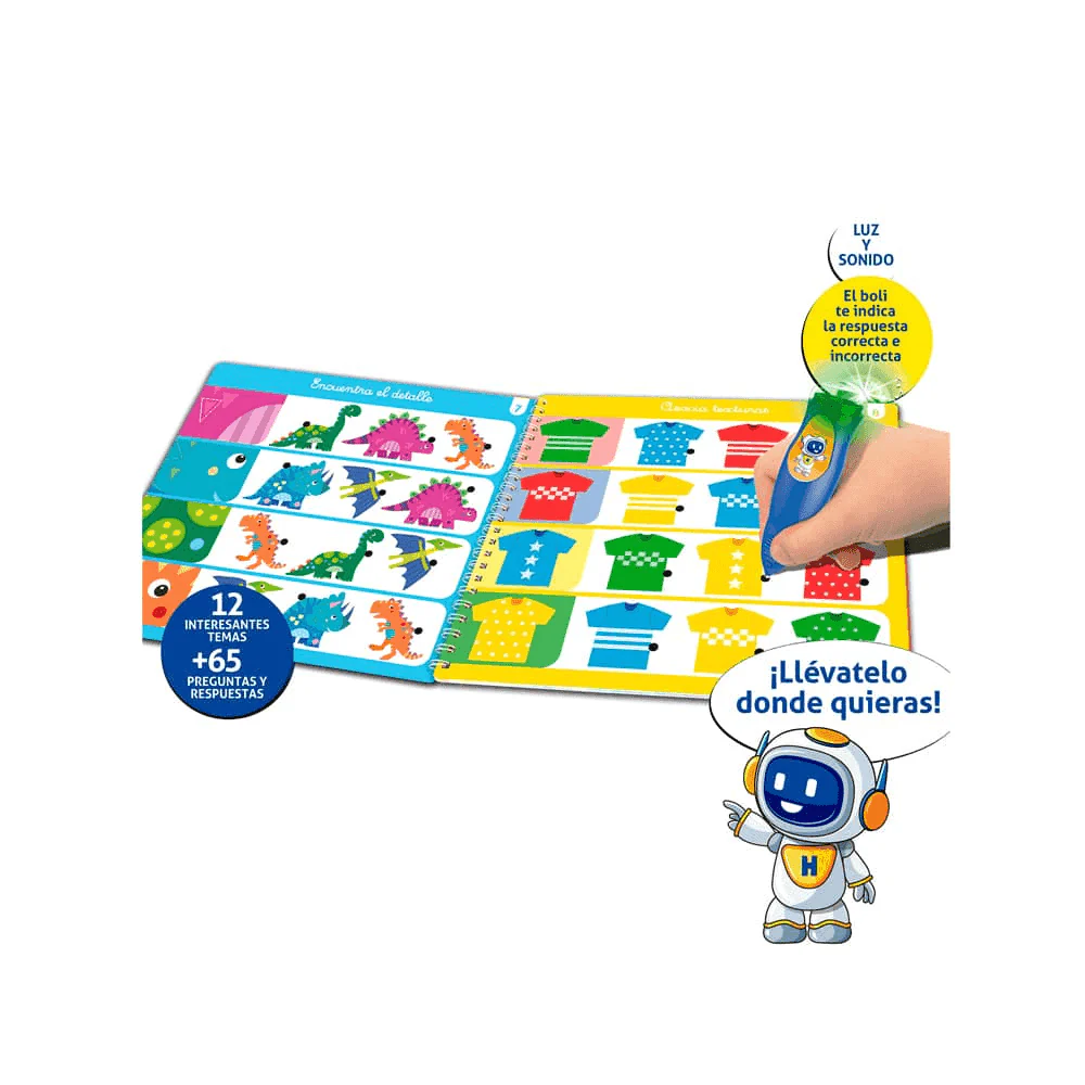 - Bolígrafo interactivo: Incluye un bolígrafo con luz y sonido que indica cuándo las respuestas son correctas, proporcionando una retroalimentación inmediata que motiva al niño.