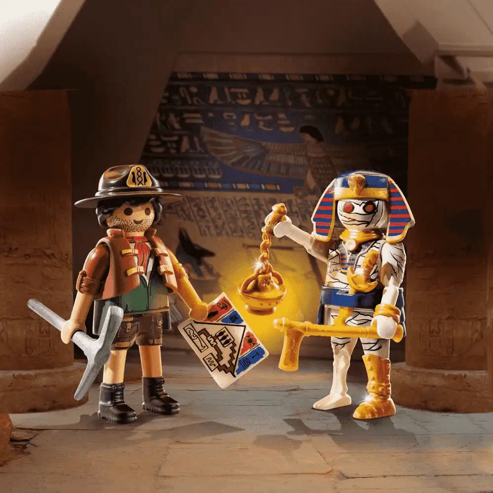 ¿Qué incluye? Grandes aventuras en el desierto con el intrépido cazador de tesoros que sigue las indicaciones de un antiguo mapa hasta una tumba oculta. Con todos sus accesorios, está listo para desenterrar los tesoros escondidos, ¡pero no está solo! Desde las sombras, una misteriosa momia protege el oro y grandes secretos enterrados durante siglos. Este emocionante DuoPack de PLAYMOBIL proporciona acción y diversión con complementos geniales, como un pico, un sombrero, un mapa, un tesoro y una peluca de faraón para aventuras de rol sin límite.