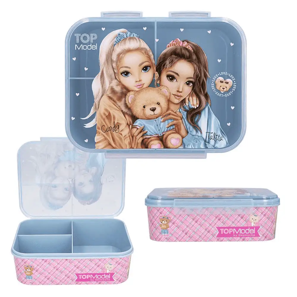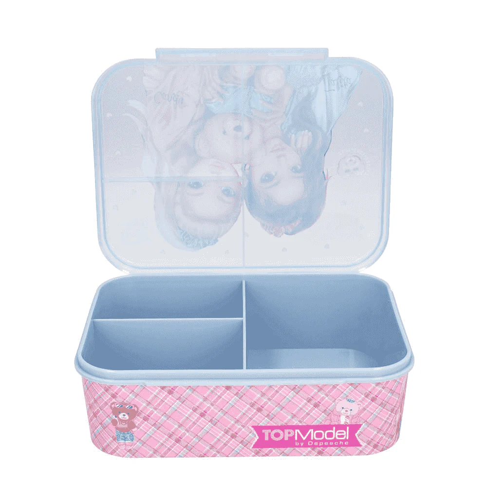 Descripción del producto: Una fiambrera color rosa, tres compartimentos separados, tapa transparente azul, estampado a cuadros tendencia y mucho estilo TOPModel con ositos preciosos. No apta para uso en lavavajillas ni microondas.